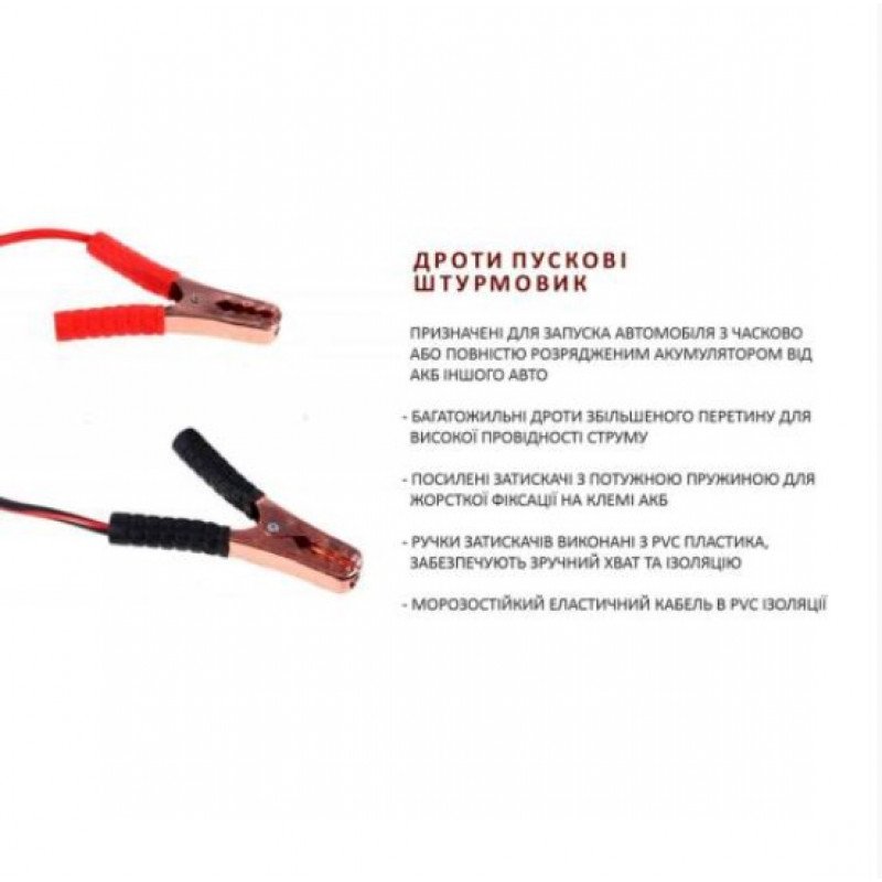 Пускові дроти Штурмовик - надійна допомога в дорозі навіть при низькій температурі. Товстий багатожильний провід забезпечить передачу струму майже без втрат, а різне забарвлення дротів допоможе не сплутати полярність.